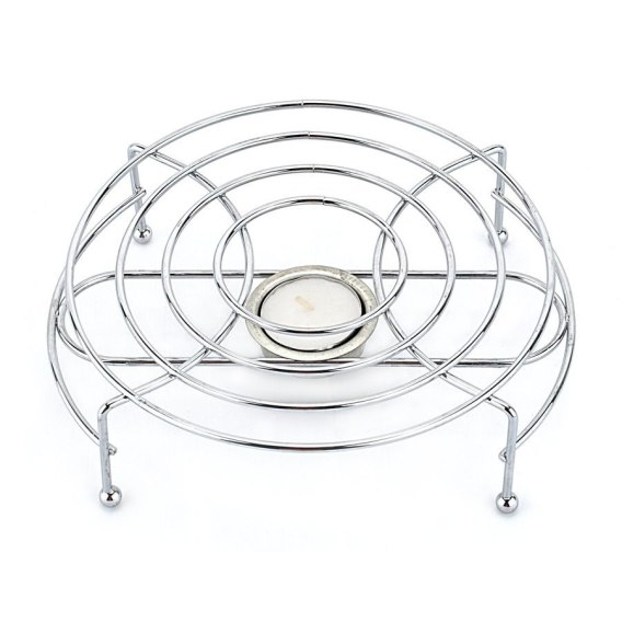 Uniwersalny i ponadczasowy, okrągły podgrzewacz. Doskonale sprawdzi się jako podstawka pod imbryk, czajniczek lub dzbanek o różnych pojemnościach, utrzymując tym samym ciepłą temperaturę napoju. Dzięki estetycznemu wykonaniu z drutu chromowanego produkt świetnie wkomponuje się zarówno w rustykalny, jak i nowoczesny wystrój kuchni lub jadalni.