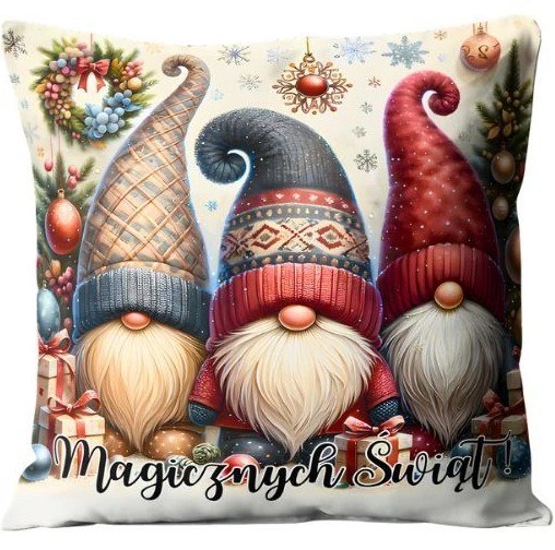 Poduszka została wykonana z miękkiego, odpornego na zużycie poliestru, który zachowuje kolor i strukturę nawet po wielu praniach. Wypełnienie z trwałej owaty gwarantuje sprężystość i wygodę użytkowania. Dzięki temu produkt łączy estetykę z funkcjonalnością - doskonale sprawdza się jako element świątecznego wystroju oraz przytulny dodatek podczas zimowych wieczorów przy choince.
