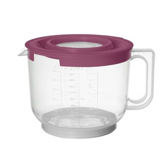 Bardzo wygodny do miksowania - gdyż pokrywka posiada mniejszy otwór - tak, aby ochronić rozpryskiwaniem. Dodatkowo pojemnik posiada dzióbek - który ułatwiający przesypywanie czy przelewanie i zabezpiecza spływanie ciasta po ściance.
