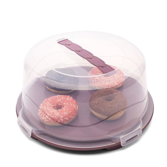 Pojemnik na ciasto Violet House 35x16 cm posiada szczelne zamknięcie (na klipsy) i uchwyt, które ułatwiają przenoszenie, gwarantując wygodny transport ciast.