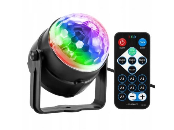Kompaktowy efekt świetlny LED odtwarza swój automatyczny program świetlny. Po włączeniu kula zaczyna świecić powodując efekt różnokolorowy, kolory zmieniają się wirują lub migają: