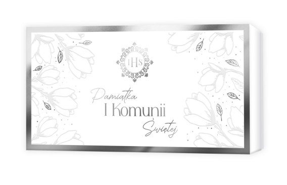 Pudełko na pamiątkę Pierwszej Komunii Świętej do wręczenia małego upominku lub koperty z pieniędzmi. Wykonane z grubej tektury i foliowanego papieru, tak by zachować trwałość. Ozdobione złoceniem i tłoczeniem, przy użyciu eleganckiego wzornictwa. W środku zawiera kartkę z życzeniami i miejscem na wpis.