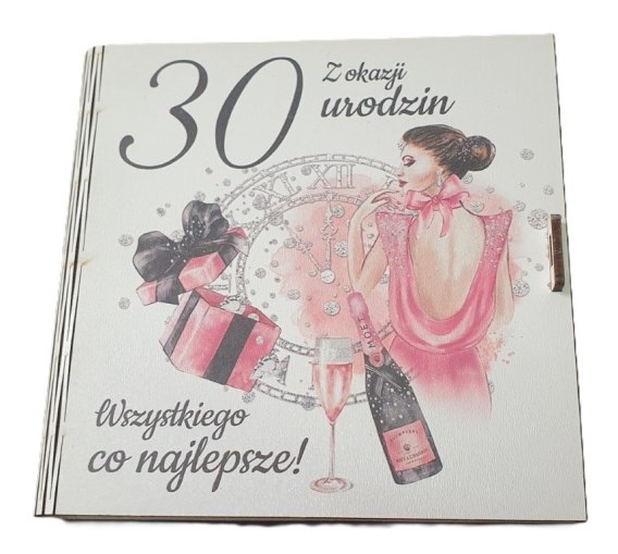 Pudełko okolicznościowe na pieniądze - kwadrat. Kolorowy nadruk z motywem 30-stych urodzin. W środku życzenia i miejsce na pieniądze dla solenizanta. Pakowane w folię.