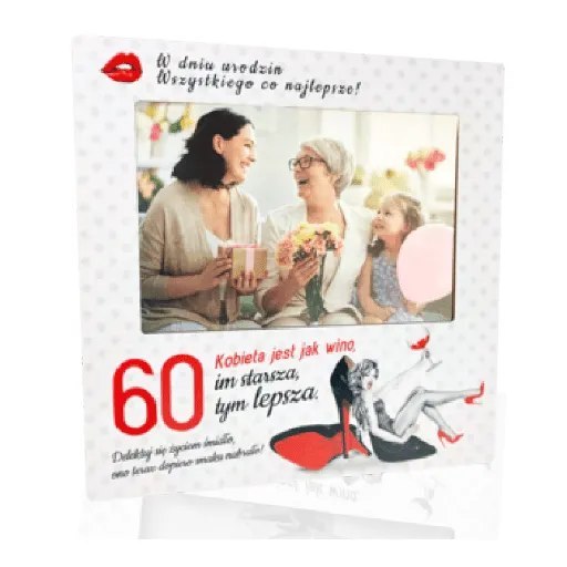 Ramka na zdjęcie dla kobiety z okazji 60 urodzin. Kolorowy nadruk z życzeniami na urodziny. Ramka na zdjęcie formatu 10 x 15 cm . Pakowane w folię.