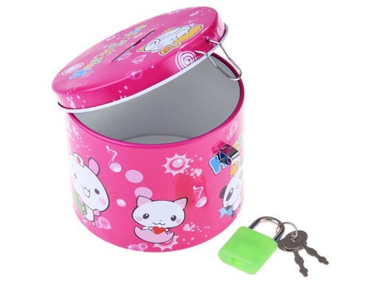 Metalowa puszka posiada otwór do wkładania pieniędzy do środka oraz jest zamykana na kłódkę z dołączonymi 2 kluczykami, aby w razie potrzeby oszczędności mogły zostać wyjęte i jeden z nich był w zapasie w przypadku zgubienia. Kolorowa puszka jest estetycznie wykonana z błyszczącego metalu z nadrukowaną grafiką wesołych zwierzątek.