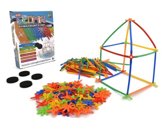 Kreatywna zabawka dla dzieci polegająca na tworzeniu konstrukcji przestrzennych za pomocą plastikowych słomek oraz łączników ?krzyżaków?. Dostępne słomki są w 5 kolorach: niebieskim, zielonym, żółtym, pomarańczowym i czerwonym co pozwala na dodatkowe urozmaicenie naszej konstrukcji nie tylko kształtem, ale też i barwą. W opakowaniu znajduje się folder z przykładowymi konstrukcjami.