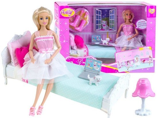Uroczy zestaw lalka z własna sypialnią i kotkiem Anlily, sprawdzi się podczas nie jednej zabawy. Lalka urządza swój dom. Pomóż jej ustawić mebelki, tak aby czuła się komfortowo. Każda mała dziewczyna marzy o urządzaniu domku dla własnej lalki.