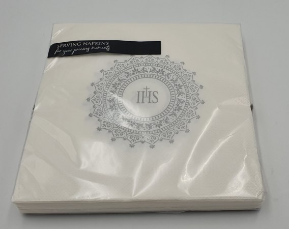 Serwetki komunijne papierowe białe ze srebrnym nadrukiem IHS, wymiary po rozłożeniu ok. 33 x 33 cm, wymiary po złożeniu ok. 16,5 x 16,5 cm.