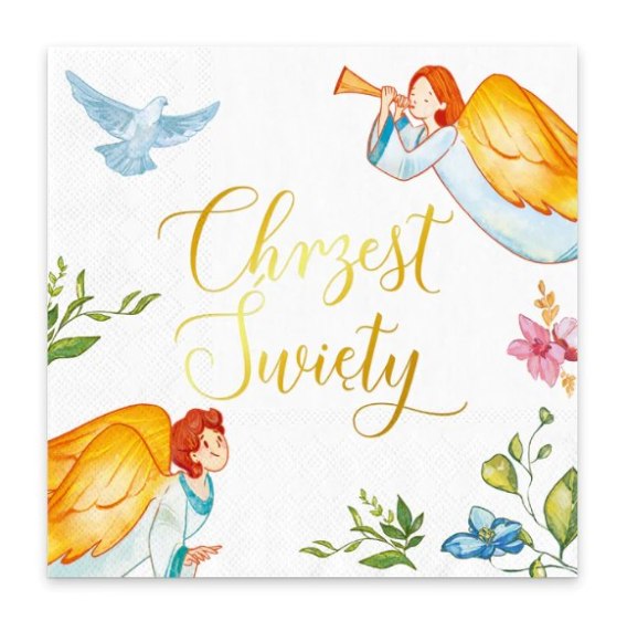 Serwetki na chrzest z kolorowymi motywami i złotym napisem Chrzest Święty. Serwetki wyróżniają się wspaniałymi rysunkami. Główną rolę grają tu aniołki wyglądające jak z filmu rysunkowego dla dzieci. Świetna grafika zaprojektowana przez zdolnego rysownika.