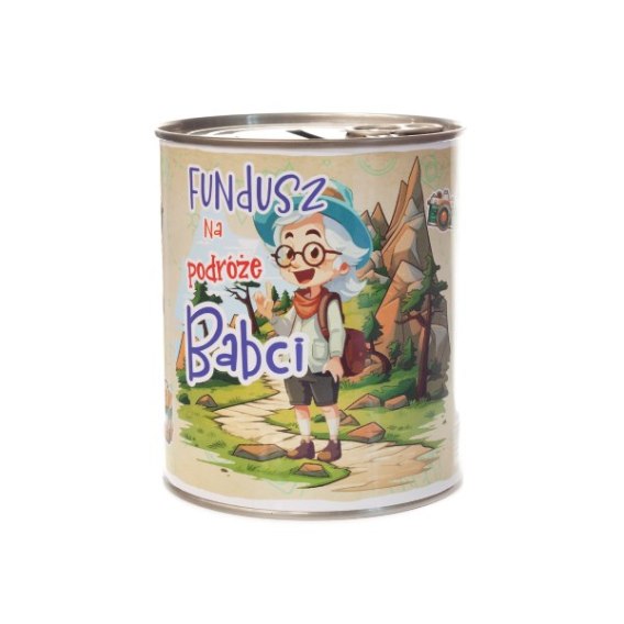Skarbonka metalowa urodzinowa z napisem "Fundusz na podróże Babci"