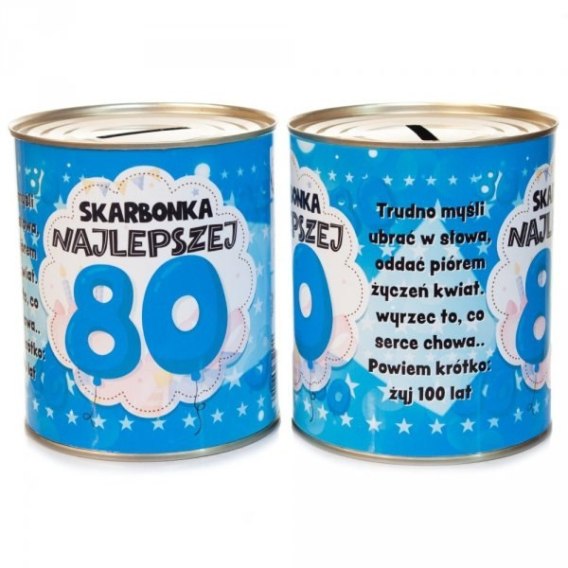 Skarbonka metalowa urodzinowa z napisem "Skarbonka Najlepszej 80"