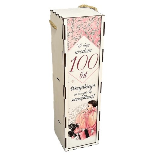 Skrzynka na butelkę dla kobiety z okazji urodzin. Kolorowy nadruk z życzeniami na urodziny. Pudełko pomieści butelkę wina lub innego alkoholu o pojemności 0,5 lub 0,7 l. Pakowane w folię.