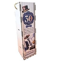 Skrzynka na butelkę dla mężczyzny z okazji 30 urodzin. Kolorowy nadruk z życzeniami na urodziny. Pudełko pomieści butelkę wina lub innego alkoholu o pojemności 0,5 lub 0,7 l. Pakowane w folię.