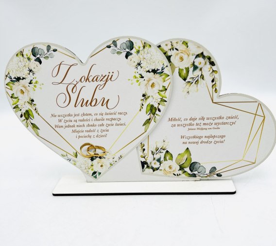 Stojak dla Młodej Pary z okazji ślubu. Kolorowy nadruk z motywem Złotego Serca i życzeniami . Pakowane w folię.WYS.16CM.SZER.30CM.