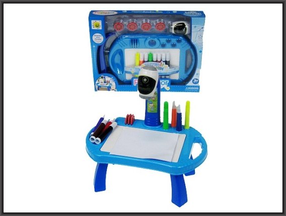 Stół - projektor o wymiarach 31x19x32cm , w zestawie flamastry w ośmiu kolorach oraz cztery kółeczka do wyświatlania o temetyce : świat zwierząt , morski świat , pojazdy i różne obrazki .