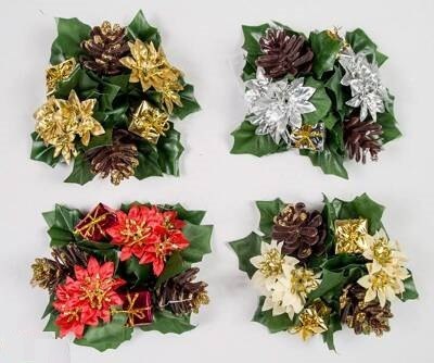 Piękne ozdobione i kolorowe stroiki kwiatowe na świecę lub jako bożonarodzeniowa dekoracja stołu. Wielkość otworu na świecę to 2,6cm.