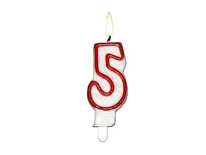 • Świeczka cyfra''5''z czerwoną obwódką i brokatem 24szt 62-05