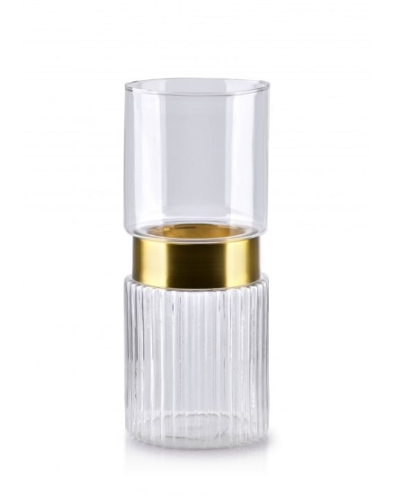 Wazon/świecznik dwuczęściowy z serii SERENITE CLEAR marki MONDEX. Idealne rozwiązanie dla osób, które lubią użytkowe produkty i piękne za razem. Górna część wazonu może służyć jako świecznik, a dolna ryflowana jako wazon lub odwrotnie. Produkt daje nam pełna dowolność zastosowania, może zmieniać się wedle potrzeb. Dzięki złotej obwolucie staje się jeszcze bardziej elegancki.