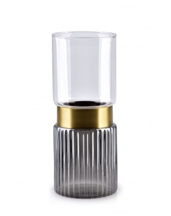 Wazon/świecznik dwuczęściowy to idealne rozwiązanie dla osób, które lubią użytkowe produkty i piękne za razem. Górna część wazonu może służyć jako świecznik, a dolna ryflowana jako wazon lub odwrotnie. Produkt daje nam pełna dowolność zastosowania, może zmieniać się wedle potrzeb. Dzięki złotej obwolucie staje się jeszcze bardziej elegancki.