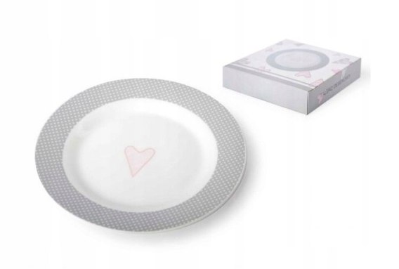 Talerz deserowy z serii porcelany AMELIE. Ozdobiony delikatnym wzorem w kropki i motywem serca. Można myć w zmywarce i używać w mikrofalówce. Pakowany w ozdobne pudełko.