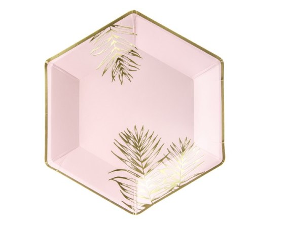 Talerzyki papierowe w kolorze jasnoróżowym ze złotym wzorem liści, średnica ok. 23 cm.