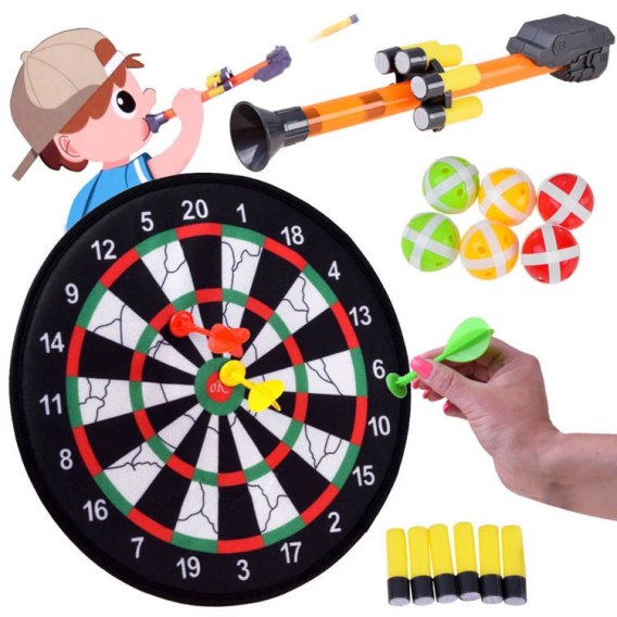 Tarcza na rzepy DART wyposażona w lotki, naboje piankowe, piłeczki na rzepy i dmuchawkę do strzelania sprawdzi się podczas nie jednej zabawy rodzinnej.