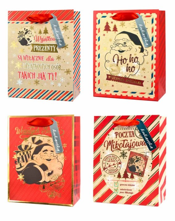Zestaw świątecznych toreb, pakowane po 12 sztuk (4 wzory) w zestawie.