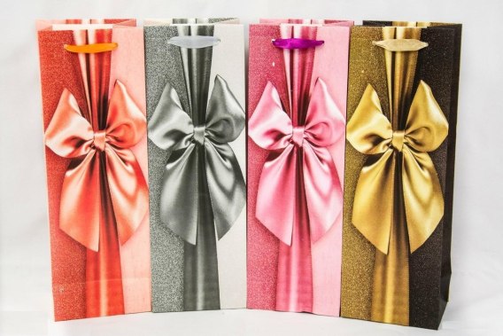 Torebka prezentowa o wymiarach idealnych do zapakowania butelki. Wykonana z sztywnego i grubego papieru o dużej wytrzymałości, ozdobione na całej powierzchni stonowanym kolorem i nadrukiem dużych kokard.