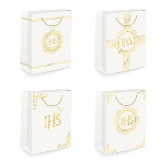 Delikatne, złote grafiki i uchwyty ze złotego sznureczka na tle nieco przytłumionej bieli, będą stanowiły elegancką oprawę prezentów podarowanych z okazji Komunii Świętej.