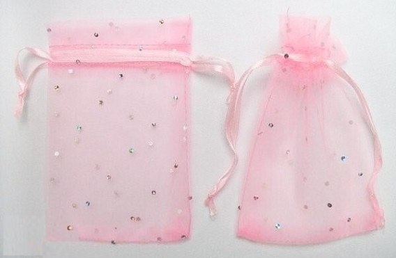 Woreczki wykonane z organzy, tiulu, ściągane u góry tasiemką satynową. Woreczki są delikatne, półprzeźroczyste oraz dodatkowo ozdobione malutkimi, błyszczącymi cekinami. Torebeczki idealnie sprawdzają się jako opakowanie drobnych dekoracji, upominków, podziękowań dla gości za przybycie lub wyrobów jubilerskich. Woreczki pakowane są po 12 szt. do małego opakowania foliowego.