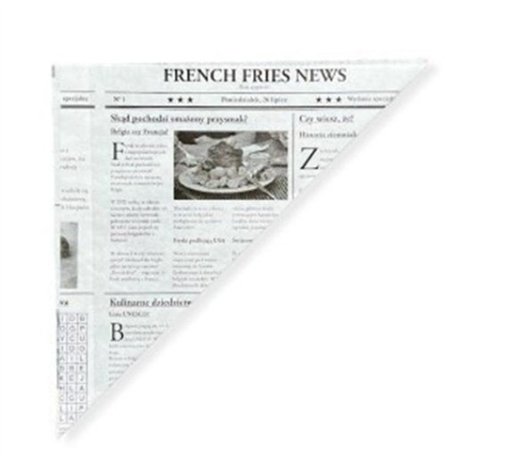 Torebki wyróżniają się wyjątkowym nadrukiem imitującym gazetę, który nadaje im retro styl i oryginalny wygląd. To doskonałe rozwiązanie dla lokali gastronomicznych, które chcą się wyróżnić i serwować przekąski w stylowy, niecodzienny sposób. Najważniejsze cechy produktu:• Wymiary: 18 x 18 x 25,5 cm• Pojemność: 200g• Materiał: warstwa z folii PE• Nadruk: stylizowany na gazetę - "French Fries News"• Kształt: trójkątny rożek• Odporność na tłuszcz• Lekkość i poręczność