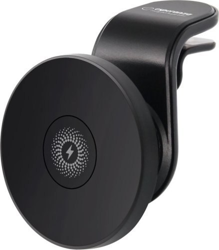 Uchwyt magnetyczny z ładowarką bezprzewodową do smartfonów, przytwierdzany do kratki wentylacyjnej w samochodzie. Umożliwia szybkie i wygodne mocowanie telefonu bez zarysowań i uszkodzeń jego obudowy  - obrót 360o.