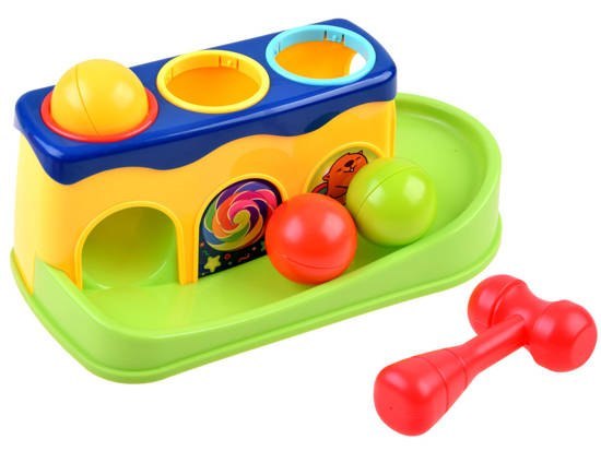 Kolorowy wbijak do uderzania młotkiem to zabawka interaktywna dla dzieci. Zestaw składa się z młotka, stojaka i 3 kolorowych piłek. Zabawa polega na uderzaniu czerwonym młotkiem w kolorowe piłki znajdujące się w otworach, tak aby wpadły na dół i potoczyły po zjeżdżalni. Produkt jest wykonany z myślą o najmłodszych dzieciach, ma gładkie powierzchnie, krawędzie są zaokrąglone. Wszystkie elementy są wykonane z kolorowego plastiku, dzięki czemu kolory nie ścierają się podczas zabawy. Zabawka ma charakter edukacyjny, pozwala dziecku na ćwiczenie umiejętności trafiania do wyznaczonego celu, rozróżniania kolorów, ćwiczenia koordynacji wzorkowo-ruchowej, rozwija zdolność logicznego myślenia. Przy okazji dziecko bawiąc się tą zabawką oszczędzi sprzęt domowy np. telefon komórkowy lub pilot od telewizora, który często służy do uderzania w cokolwiek lub gdziekolwiek.