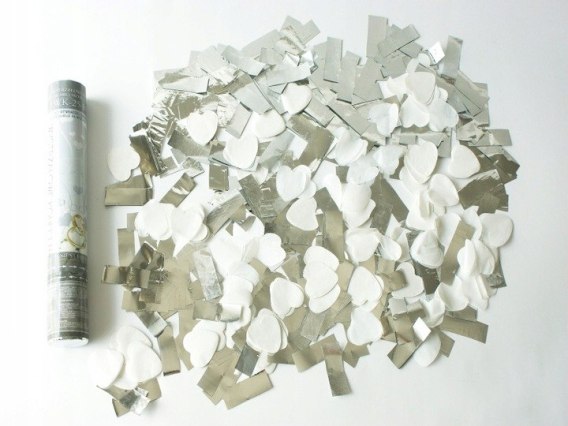 • Wystrzałowe konfetti BIAŁE serca i srebrne serpentyny 25cm | 69-11