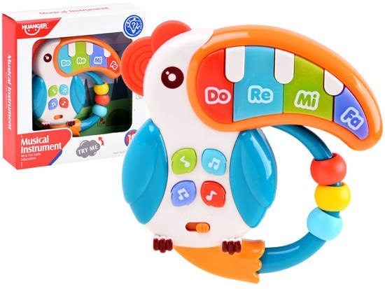 Muzyczny tukan, to zabawka dla najmłodszych pociech. Tukan to interaktywna zabawka z kolorowymi przyciskami, koralikami, wesołym wyglądem. Zabawka organki są wykonane w całości z plastiku, w atrakcyjnych żywych kolorach.