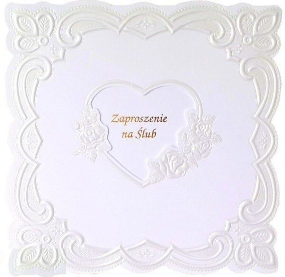 Zaproszenia na ślub, wykonane z perłowego papieru, z tłoczonymi zdobieniami i ornamentami. Treść wypisana ozdobną, złotą czcionką. W zestawie koperta oraz potwierdzenie przybycia.