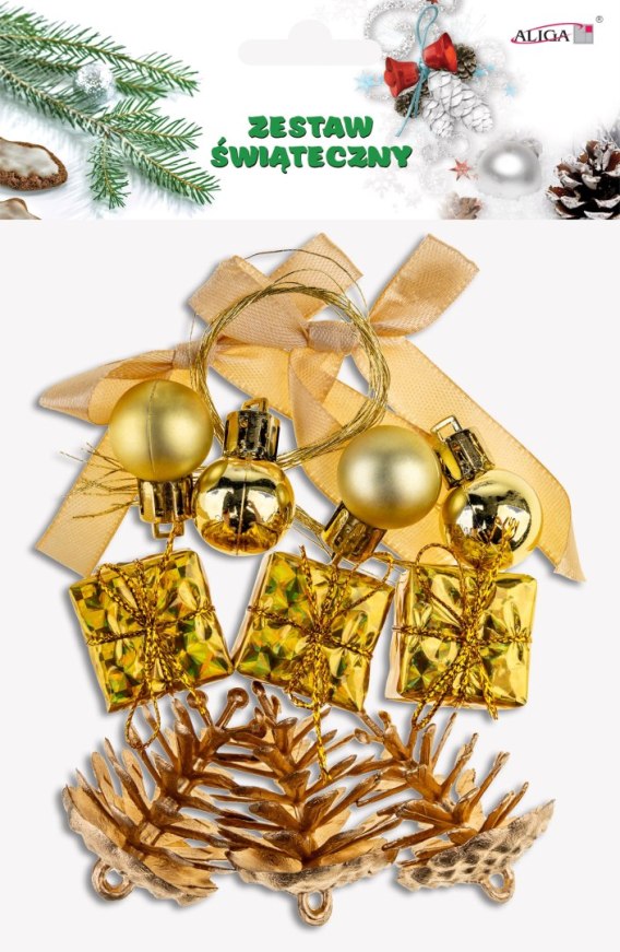 Zawieszki zestaw świąteczny 4 bombki, 3 miniprezenty 3 szyszki, 2 kokardki, 4 sznureczki, kolor złoty SGD-01