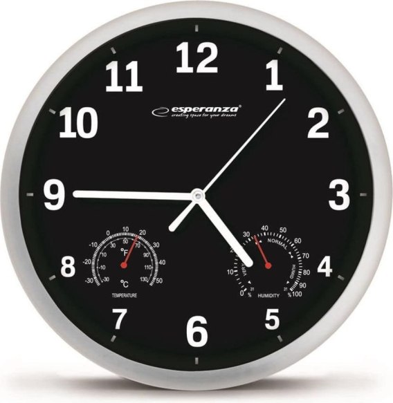 Zegar ścienny Esperanza Lyon w kolorze czarnym. Zegar jest wyposażony w dodatkowe opcje pokazujące temperaturę oraz wilgotność powietrza.