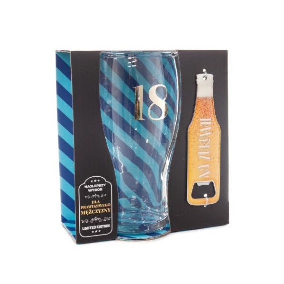 Zestaw 2w1 szklanka do piwa ze złotą cyfrą "18" z otwieraczem do butelek "Na zdrowie " w ozdobnym opakowaniu prezentowym . 500 m