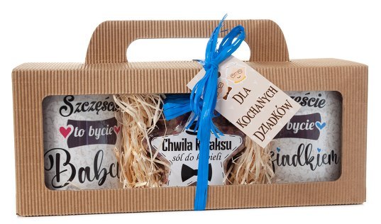 Zestaw dla kochanych dziadków z solą do kąpieli i dwoma kubkami w ozdobnym opakowaniu "Szczęście to bycie Babcią - Szczęście to