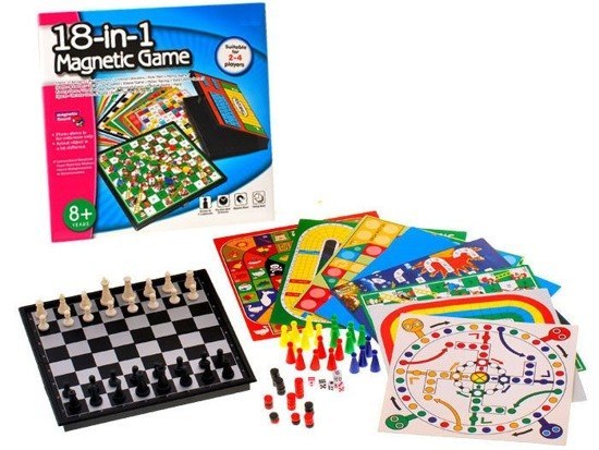 Zestaw 18 gier: Bieg z przeszkodami, Dziewięciu mężczyzn Morrisa, Wszędzie, Football, Gęś, Manji Szachy Route, Space - venture, Szachy - pociąg, Baseball, Ludo, Szachy, Tryktrak, Warcaby, Warcaby chińskie, Węże i drabiny, Wyścig, Wyścig F1