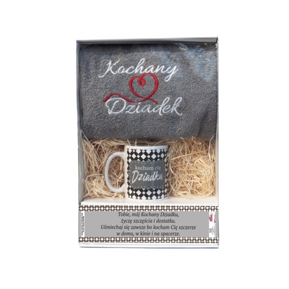 Zestaw prezentowy z szarym ręcznikiem "Kochany dziadek " i kubek "Kochany dziadek" w ozdobnym opakowaniu