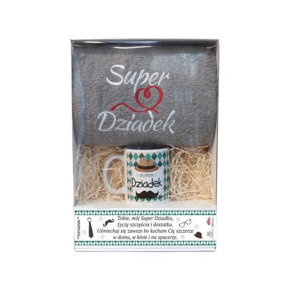 Zestaw prezentowy z szarym ręcznikiem "Super dziadek " i kubek "Super dziadek" w ozdobnym opakowaniu