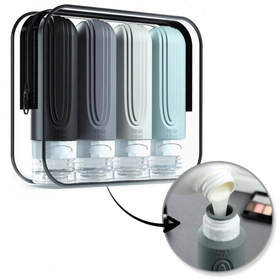 4-częściowy zestaw silikonowych buteleczek, specjalnie zaprojektowanych do przewożenia kosmetyków w podróży.
